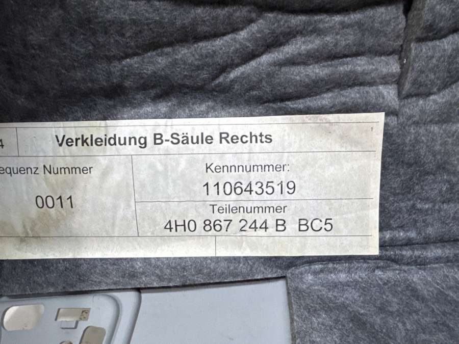 Купить Обшивка стойки центральной правой (накладка) Ауди А8 Д4 (2010 - 2017) на авторазборке для иномарок Europodbor.ru в Новосибирске.