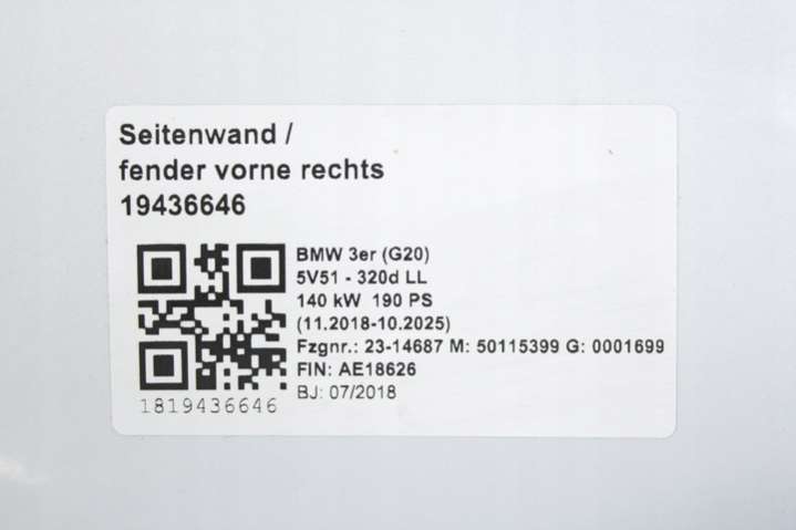 Крыло переднее правое к BMW 3 G20/G21 (2018-2022), 2018